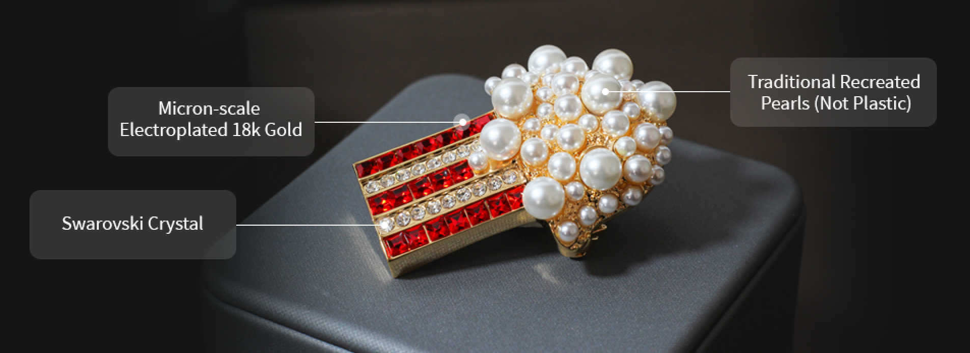 For the pearls, we use traditional reconstituted pearls (natural pearls are also available). This brooch is incredibly popular and makes it the perfect popcorn gift!